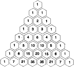 Przyjrzyjmy się teraz własnościom trójkąta Pascala. Jeśli umieścimy pierwsze 8 wierszy z Trójkąta Pascala w sześciokątach, każdy wyraz w osobnym, otrzymamy: