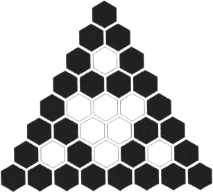 Zakreślmy teraz wszystkie sześciokąty, w których występują liczby nieparzyste, natomiast te z liczbami parzystymi zostawmy puste. Dostaniemy następujący trójkąt: