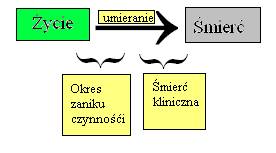 Umieranie jest procesem zdysocjowanym co oznacza, że nie następuje ono od razu a śmierć jest poprzedzona przez cały szereg zmian zachodzących w organizmie, które składają się na proces umierania. Początkowo dochodzi do postępującej utraty funkcji życiowych: tj. oddychania, krążenia i świadomości. Jest to okres zaniku czynności. Gdy funkcje te zanikną osoba umierająca wchodzi w okres śmierci klinicznej. Jeśli warunki fizjologiczne są sprzyjające i pomoc udzielona jest szybko w czasie 3-5 min. wtedy zmiany te mogą zostać odwrócone. O tym, w jakiej kolejności dochodzi do umierania poszczególnych tkanek i układów decyduje ich zapotrzebowanie na tlen. Najszybciej umierają tkanki wysoko wyspecjalizowane, które ze względu na zachodzące w nich liczne przemiany metaboliczne, do prawidłowego funkcjonowania potrzebują stałego dopływu tlenu.
