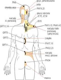 Podsumowując akupunktura wpływa regulacyjnie na poziom energii w organizmie, a także na jej obieg. Punkty akupunktury cechują się kilkakrotnie mniejszą opornością elektryczną niż otaczająca je skóra, w ich obszarze znajduje się znaczna ilość receptorów czuciowych. Poniższy rysunek obrazuje punkty akupunktury i przyporządkowane im narządy: