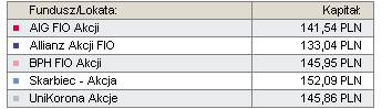 Na stronach internetowych funduszy można znaleźć różnorodne porównania i wykresy prezentujące historyczne osiągnięcia konkretnych funduszy. Na powyższym wykresie zestawiłam ze sobą wyniki kilku funduszy akcyjnych, przy założeniu jednorazowej wpłaty w wysokości 100 złotych, dane za ostatnie 12 miesięcy. Dane te uwzględniają już prowizję (około 3,5%) za prowadzenie rejestru w funduszu inwestycyjnym. Niektóre fundusze pobierają dodatkowe opłaty za nabycie lub/i odkupienie jednostek uczestnictwa.